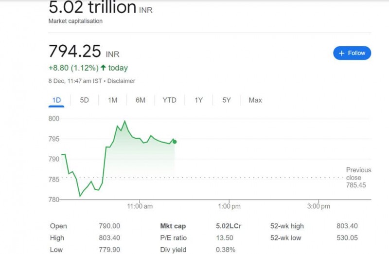 周五,印度人寿保险公司股价在孟买证券交易所创下52周新高。上午11点50分,该保险公司的股价为794.30卢比,比孟买证券交易所上涨8.85卢比或1.13卢比。