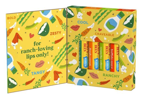 快进到2024年,这两个品牌把这个笑话变成了现实。1月17日,Burt 's Bees和Hidden Valley Ranch宣布推出限量版4包Burt 's Bees唇膏,包含Hidden Valley Ranch、水牛酱、脆芹菜和新鲜胡萝卜的经典口味,售价11.99美元。这些公司在超级碗(也被称为“翼季”)前几周及时发布了这些商品。