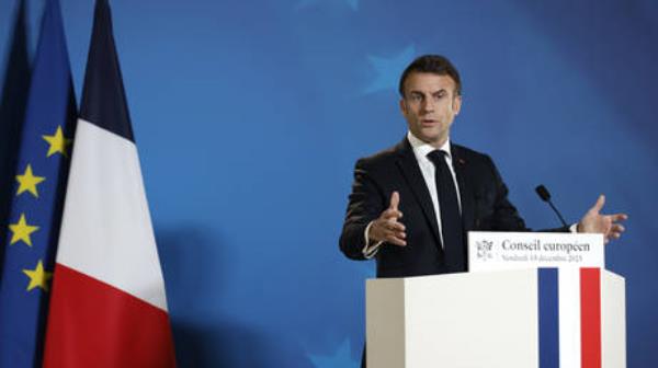 这位法国领导人要求莫斯科尊重“乌克兰的利益和主权”。2023年12月15日,在布鲁塞尔举行的欧盟峰会结束时,法国总统马克龙在新闻发布会上发表讲话。?美联社/ Omar Havana