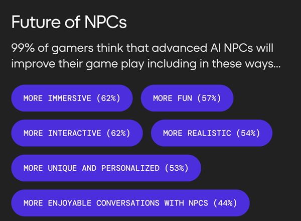 尽管如此,研究显示52%的玩家抱怨当前的npc“只会重复对话”,99%的玩家期待更聪明的npc, 81%的玩家甚至愿意为npc支付更多费用。