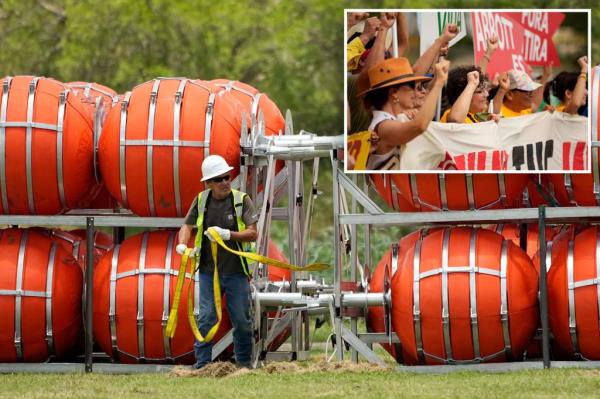 德克萨斯州工人开始在格兰德河沿岸安装浮动屏障,以阻止移民越过危险的河流非法进入美国。