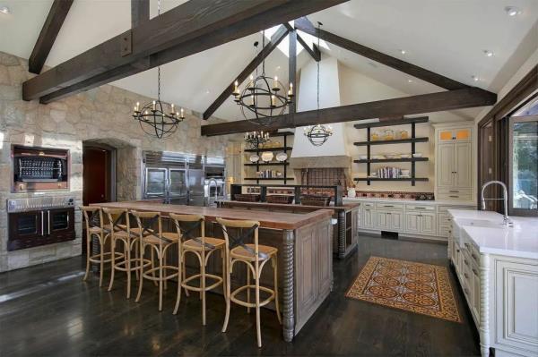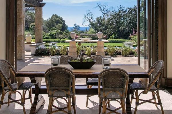 “主屋仍然保留了其原有的美学,比如白色的灰泥外墙和高大、摇曳的棕榈树构成的红瓦屋顶,”《建筑文摘》(Architectural Digest)说。圆形大厅的入口通往风景如画的客厅,客厅有一整面墙的法式门,通往阴凉的砖砌用餐露台。沙黄色的硬木地板和木梁天花板给空间一种温暖的感觉。”