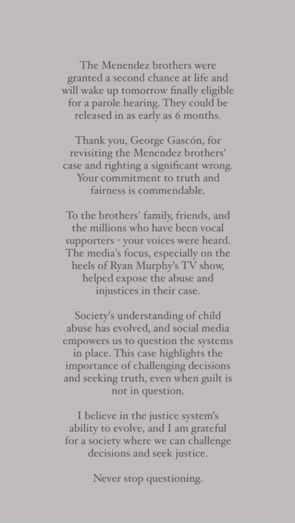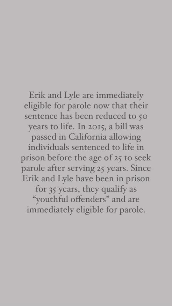这位43岁的真人秀明星在她的Instagram故事中写道:“梅嫩德斯兄弟获得了生命中的第二次机会,明天醒来时终于有资格获得假释听证会。”