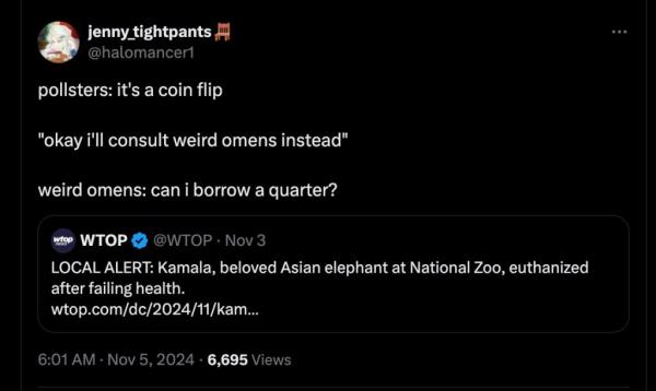 另一位X用户插话道:“这是个坏兆头,但对谁来说呢?它是一头大象,共和党的动物,但和民主党候选人一样,叫卡玛拉。先知们感到不安。”