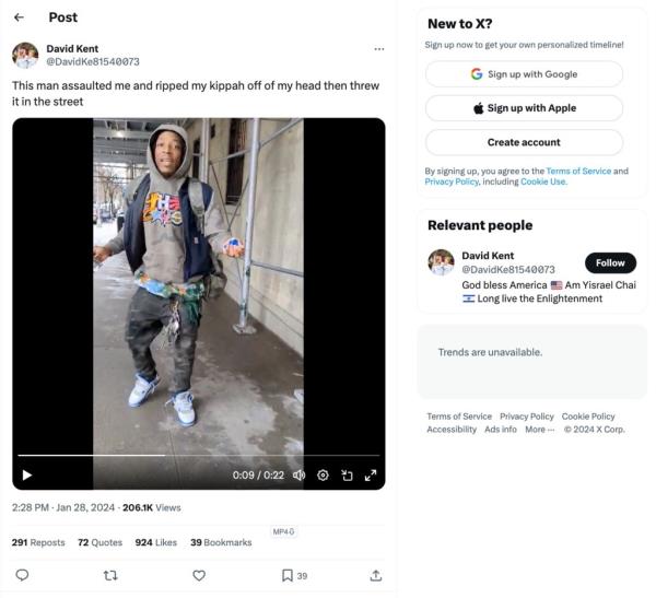 根据警方和令人不安的视频,1月28日,一名愤怒的仇恨者从一名犹太男子的头上抢走了圆顶小帽,扔在街上,这是上西区发生的一起明显的反犹袭击。警方称,这场扭曲的晨间长谈发生在百老汇和西86街的拐角处,当时28岁的凯文·邓洛普(Kevin Dunlop)称42岁的大卫·肯特(David Kent)是“假犹太人”和“傻蛋”,然后从他头上扯下基帕。当警察抓住邓禄普时,他的钥匙扣上挂着一把重力刀。邓禄普被逮捕,并被指控犯有包括仇恨犯罪在内的刑事恶作剧罪,以及持有武器罪。2月12日,一名反犹分子用棍子击中了一名25岁男子的头部
