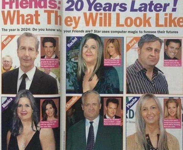 该杂志声称使用了“电脑魔法”来观察詹妮弗·安妮斯顿(瑞秋·格林饰)、柯特妮·考克斯(莫妮卡·盖勒饰)、大卫·修默(罗斯·盖勒饰)、丽莎·库卓(菲比·布菲饰)、钱德勒·宾(钱德勒·宾)和马特·勒布朗(乔伊·崔比安尼饰)20年后的样子。
